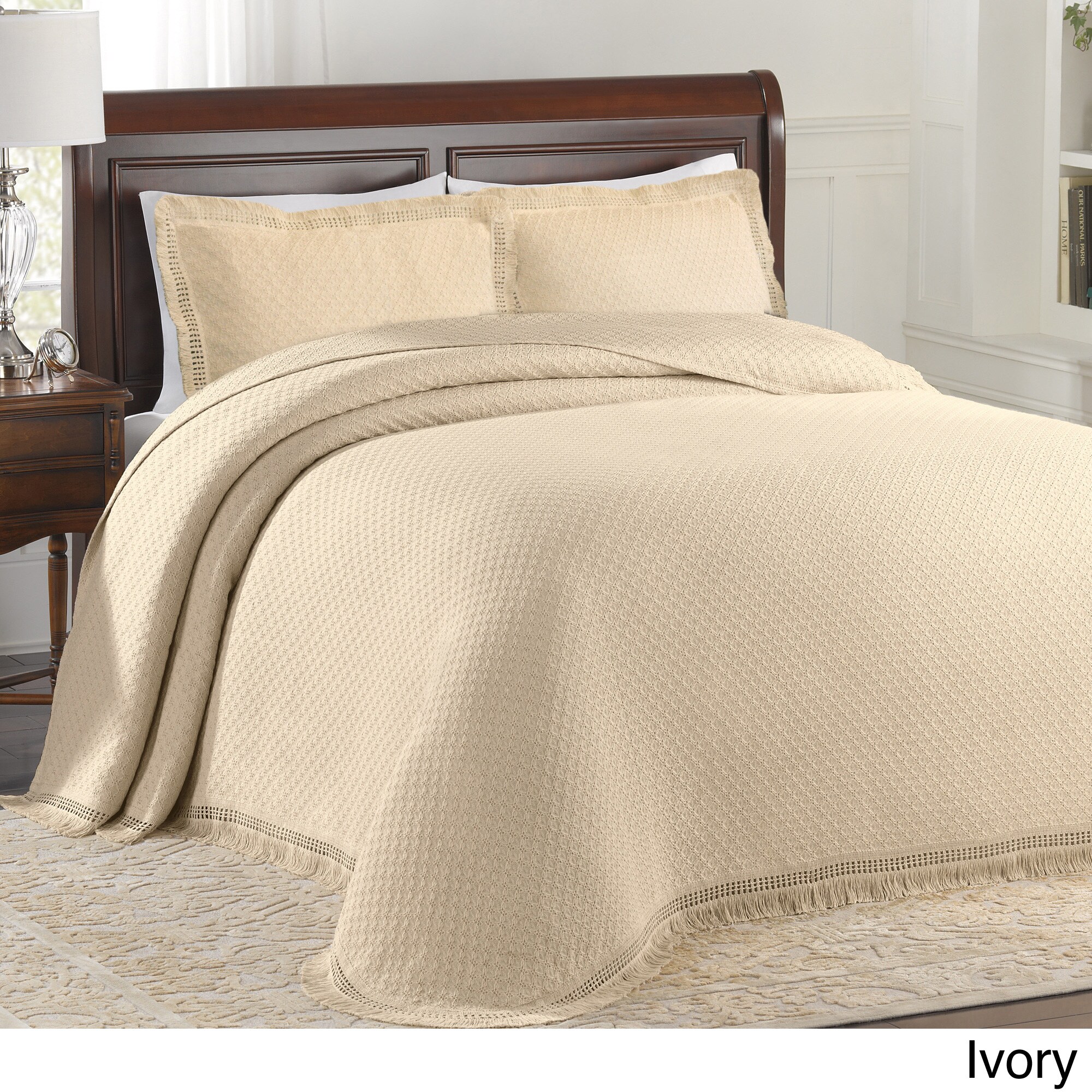 This classic pattern is crafted from 100% cotton and is woven into a matelassé pattern on a jacquard loom. Bluenilemills premium 100% cotton woven jacquard matelasse bedspread set, oversized bedding, embossed cotton fabric, soft, breathable, medium weight, basketweave, queen, deep sea by blue nile mills. Featuring the simple elegance of a diamond design with a fringed hem, this high quality woven bedding adds soft visual appeal to your bed. Fringed bedspread features a woven center medallion on the top of the bed, surrounded by floral scrolls. Only 2 available and it's in 2 people's carts. Fringe on three sides is 100% cotton. 33.38'' h x 27.5'' w; Dry clean, rod not included. Original retailers of america's favorite bates mill bedspreads. If you prefer a bed cover with a shorter drop, please visit our coverlet collection. Woven jacquard cotton blend full white bedspread set turn your bedroom in to a luxurious sanctuary turn your bedroom in to a luxurious sanctuary with the woven jacquard bedspread set. Woven with the finest quality yarns on traditional jacquard looms, our matelassé collection is and has been woven in maine for over 60 years. 5 out of 5 stars.